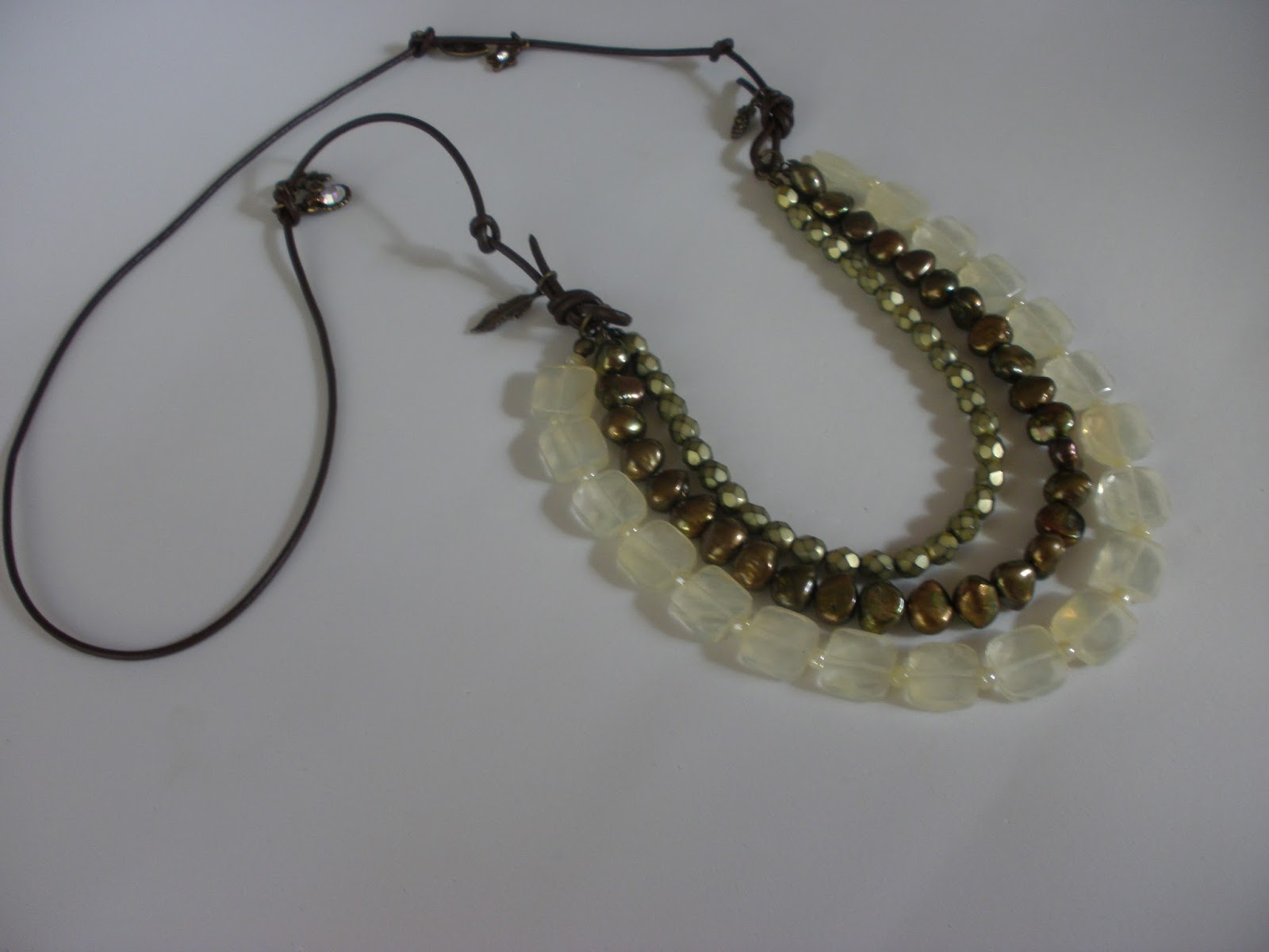 Colar em pérolas de rio, pedra prenhithe, e cristais ouro velho, com acabamento em couro com nós e pingentes com strass.